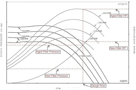 If nothing is done to correct for the varying pressure drop across the filters, the collector will perform in the following fashion. In the early stages of the filter life when the pressure drop across them is low, the fan will move more air than is required. This produces negative effects on energy consumption and also causes a higher velocity of air entering the filters. When high velocity air enters filters, the dust particles are embedded deeper and filter life is reduced. At the end of the filter life the fan will most likely not be moving sufficient amounts of air to maintain good capture velocity, and dust and fumes may not be collected at a satisfactory level. A graphical representative of this is show below in figure 1.