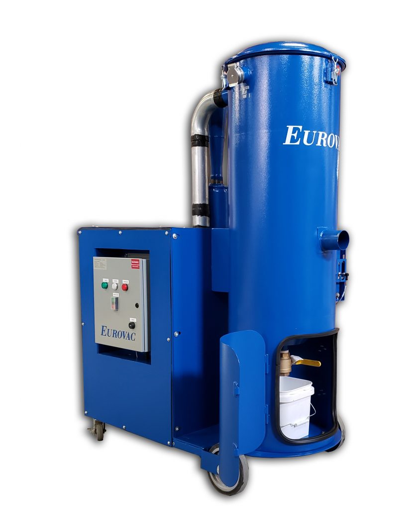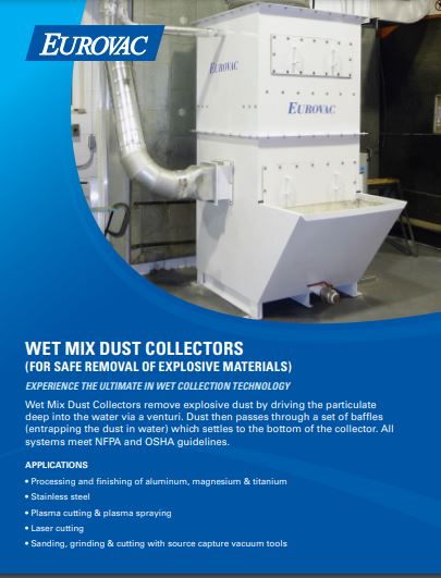 EuroVac Wet Mix Dust Collectors – remove explosive dust by driving the particulate deep into the water via a venturi. Dust then passes through a set of baffles (entrapping the dust in water) which settles to the bottom of the collector. All systems meet NFPA and OSHA guidelines.