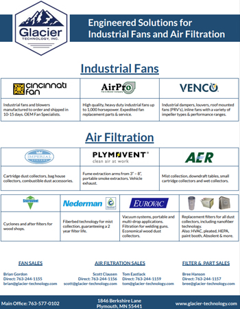 Looking for additional information and resources relating to industrial fans and air filtration? You have come to the right place. Find information on a variety of topics listed below. Also included are quick links to our line card, informational videos, and pdf downloads.